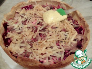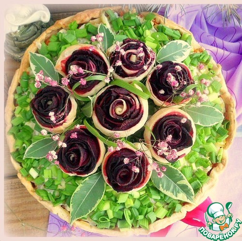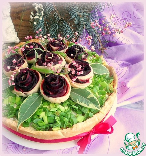 Вторую часть теста раскатать и выложить в форму, формируя бортики, на тесто - пергамент, на него - горох. Выпекать вместе со свекольными розочками около 30 минут при температуре 180 градусов.