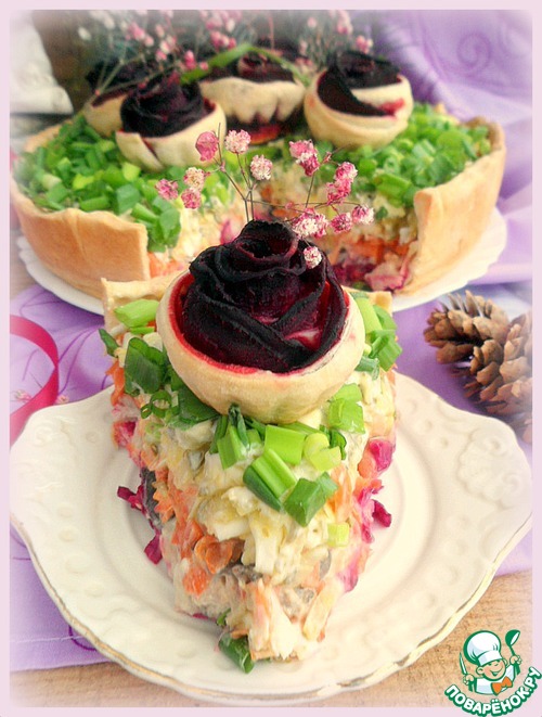 Посыпать мелко нарезанным зеленым луком, украсить свекольными розами и подать к столу.