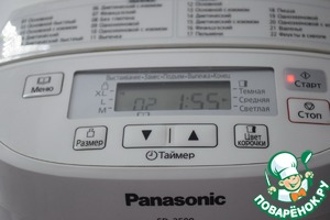 Закладываем в ведерко ХП все продукты согласно инструкции: у меня дрожжи, мука, соль, сахар, масло, молоко и вода. Выбираем программу "Быстрый хлеб", размер - XL (на 600-650 г муки), цвет корочки - по желанию.