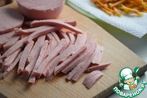 • Колбасу порезать тонкой соломкой.