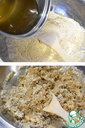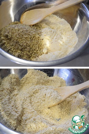 В чашку высыпать перемолотые орехи и обжаренную муку. Хорошо перемешать.