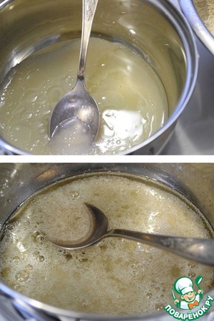 В кастрюльку высыпать сахар, вылить масло и воду. Довести при постоянном помешивании смесь до кипения и проварить (на среднем огне) до полного растворения сахара. Снять смесь с огня и дать остыть в течение 10-15 минут.