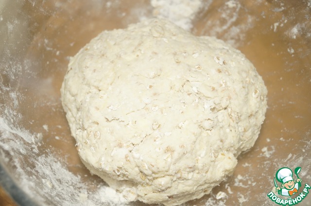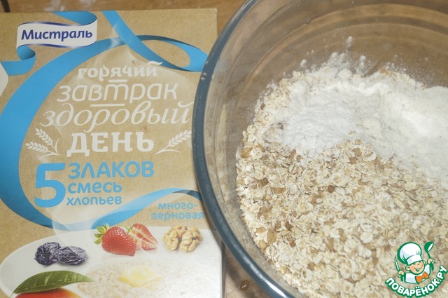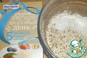 Муку просеять, смешать с разрыхлителем, солью и хлопьями.