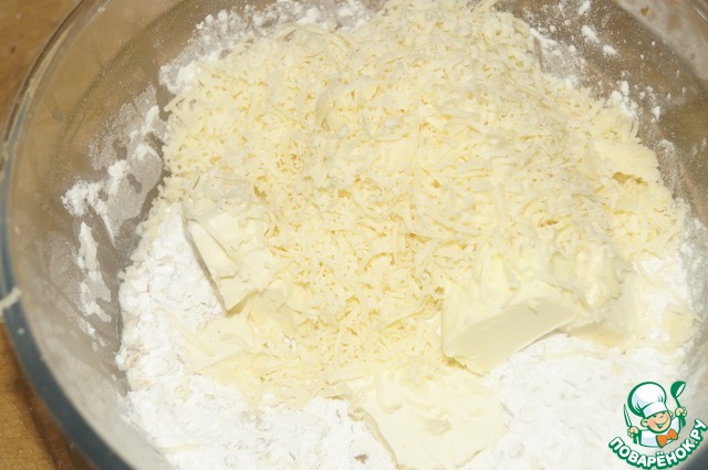 В сухую смесь добавить размягченное сливочное масло и натертый на мелкой терке сыр. Все перетереть руками.