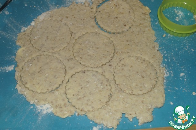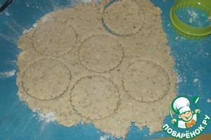 Затем тесто поделить на 2 части и раскатать в пласт толщиной около 5 мм. Вырезать формочками печенье. Диаметр моих формочек 7 см, у меня получилось 25 печений.