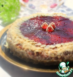 Немного остужаем крем и наносим крем на коржи. Четыре коржа складываем один на один, а последний переворачиваем, чтобы ровная поверхность было сверху. Наносим джем и оформляем по вкусу - я обсыпала бока крошкой 5го коржа и орехами
