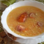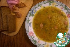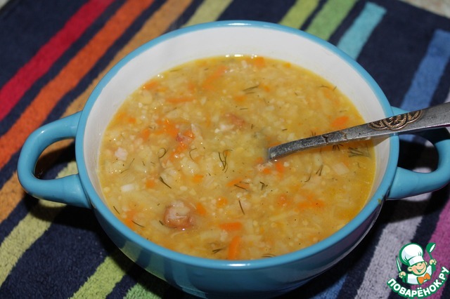 Пробовала кукурузный суп-пюре в кафе, захотелось угостить домашних! Но сейчас у кукурузы не сезон, а консервами лучше не злоупотреблять... Сделала зимний кукурузный суп а-ля рюс!.:) Гороховое пюре с кукурузной крупой - вкусно! Оранжево, сытно.