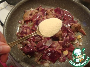 Присыпаем печень манкой по всей сковороде и перемешиваем тщательно.