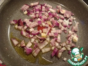 На сковороду с толстым дном наливаем масла оливкового, нагреваем и выкладываем лук порезанный произвольно (как любите и нравится).