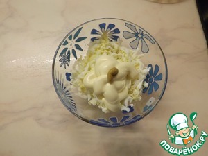 Яйца очистить, натереть на крупной тёрке. Смешать в миске яйца, майонез, горчицу. Советую не пренебрегать горчицей, она придает блюду особый вкус.