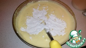 Просеянную муку, крахмал, разрыхлитель в 3 приема вводим в тесто и перемешиваем.