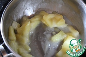 Для начинки: ананасы сложить в ковш, добавить 1 ч. л. сахара, 25 мл воды и 1 ч. л. крахмала. Варить до загустения.