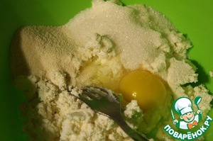Творог размять вилкой, добавить к нему манную крупу, сахар, соль, яйцо, хорошо перемешать. Пшенные хлопья залить горячим молоком, накрыть блюдцем и оставить на 3 минуты.