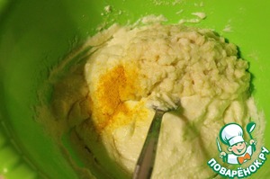 К творожной массе добавить куркуму и разбухшие хлопья. Перемешать.