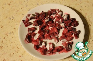 Каждую вишенку разрезать пополам и присыпать 1 ч. л. крахмала, добавить к творогу, аккуратно перемешать.