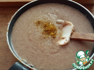Добавьте сюда пюре из гречки, разведите бульоном до густоты сметаны