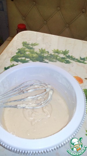 Добавляем муку и соду, перемешиваем венчиком и ставим в миску с теплой водой минут на 15, чтобы расстоялась мука, тесто должно получиться густоватое, поэтому нужно муку добавлять по мере необходимости