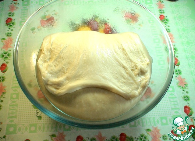 Тесто сформировать, подкатать в шар, выложить в миску, смазанную растительным маслом, поставить на брожение на 1,5 час