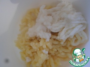 Картофель (желательно еще горячий) пропускаем через мясорубку вместе с рисом.