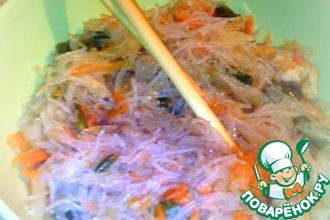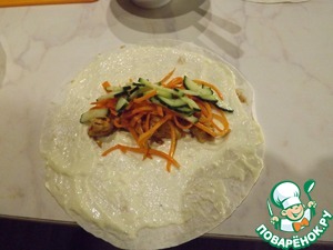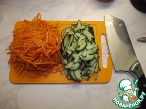 • Огурец порезать соломкой. Подсолить. При желании можно добавить любые овощи - свежую капусту, помидоры, сладкий перец.