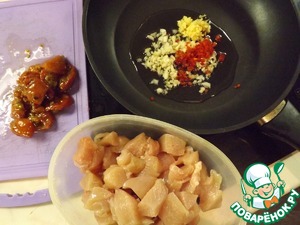 • Мелко порубить очищенный чеснок (5 зубчиков), красный жгучий перец и корень имбиря. Мелко порубить вяленые помидоры (можно данный ингредиент не добавлять, а заменить на свежие помидоры, их обжаривать не нужно). Порезать куриное филе.