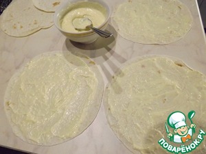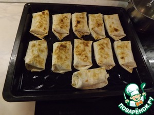 • Завернуть и выложить шаурму на смазанный растительным маслом противень. Сверху тоже сбрызнуть растительным маслом.