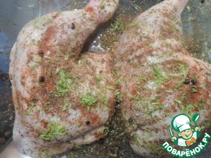 Окорочка моем, обсушиваем. Посыпаем солью, паприкой, перцем, кориандром. Добавляем перец горошком, цедру лайма и раздавленный чеснок. В таком виде, не перемешивая, отправляем в предварительно разогретую до 200 градусов духовку.