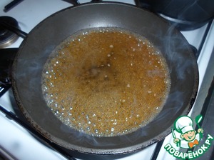 Делаем карамель. Сахар (я использовала тростниковый ТМ Мистраль) всыпаем на горячую сковороду и ждем, пока он полностью растает.