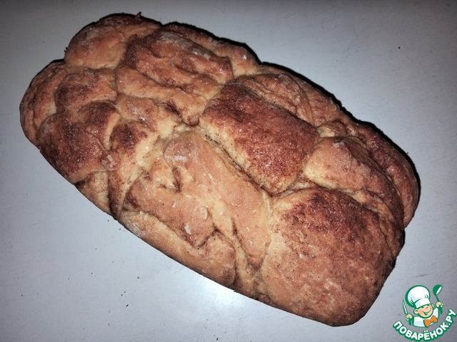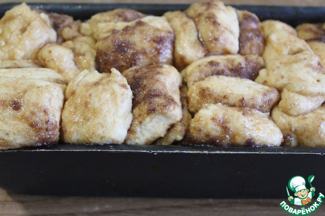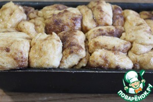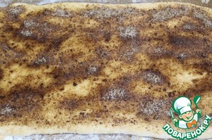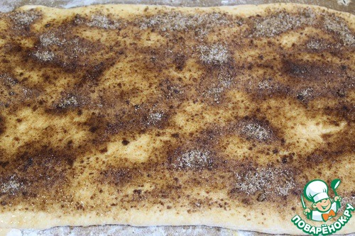 150 гр сахара соединить с корицей. 2 ст. л. сливочного масла растопить. Достать тесто, стол посыпать мукой и вымесить тесто. Раскатать тесто в прямоугольник