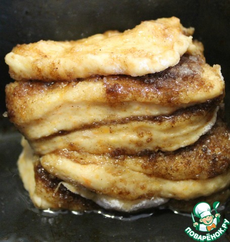Разрезать тесто в длину на 5-6 одинаковых полос и сложить их одна на одну, разрезать стопку на 6 частей и выложить их в форму, предварительно смазав ее растительным маслом