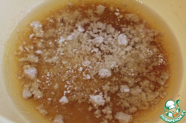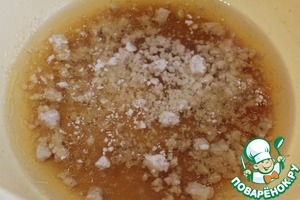 В чашу влить сок, насыпать 60 гр сахара. Сливочное масло нагреть до коричневого цвета, влить к соку, размешать