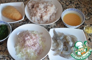 4. Подготовить ингредиенты: булку замочить, яйцо взбить, рыбное филе мелко порубить, креветки очистить и удалить вену, зелень мелко порубить, а чеснок пропустить через пресс. Масло довести до комнатной температуры.