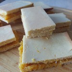 Готовый корж, еще горячим, разрезаем на прямоугольники или ромбы. Если опоздать с разрезанием, корж затвердеет и аккуратно его разрезать без крошек не получится.