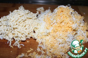 Яйца отвариваем, чистим и остужаем. На мелкой терке трем яйца и плавленный сыр.