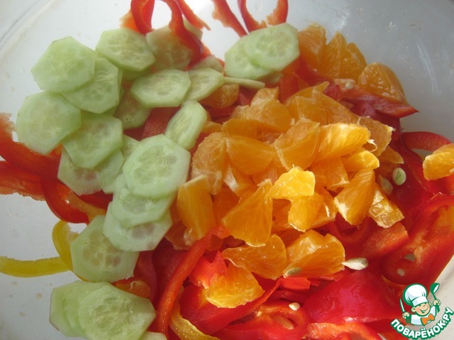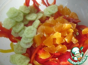 Добавить нарезанные кружочками огурцы и кусочки нарезанных апельсинов