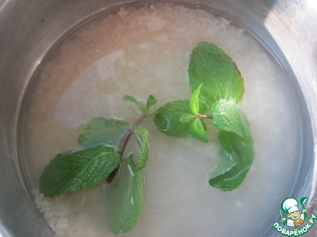 Пока занимаемся овощами варим рис Ориент ТМ "Мистраль" с добавлением листиков мяты-это придаст рису и всему салату нежный привкус и аромат мяты