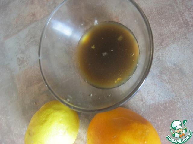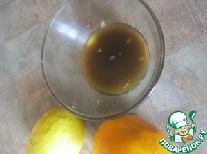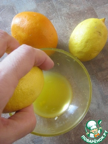 Начинаем делать заправку-выдавливаем сок апельсина и лимона, соединяя их