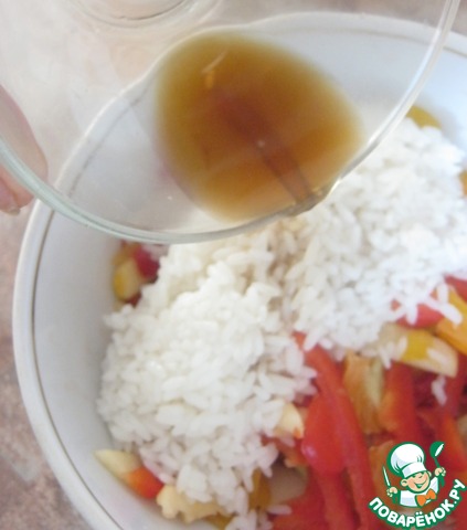 К овощам добавляем сваренный рис и заправку. перемешиваем