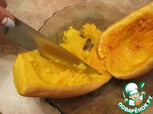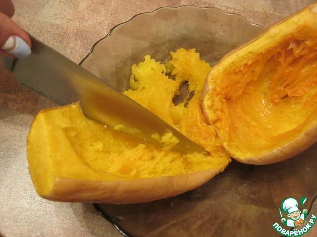 Печёную тыкву размять и сделать из печеной мякоти пюре (я запекаю в микроволновке 10 минут)