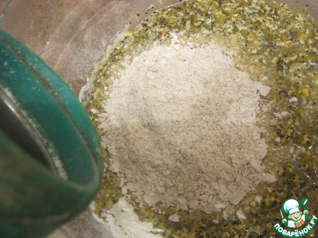 В одну часть добавить просеянную муку и 1ч. л. разрыхлителя
