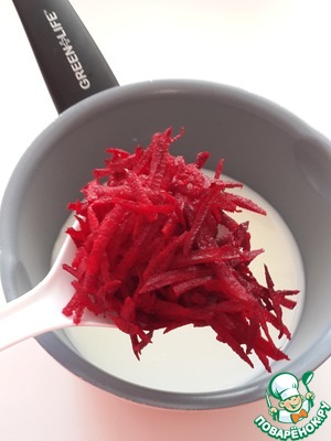 Свеклу натрите на терке, молоко смешайте со сливками, поместите в него свеклу и ванильный сахар. Поставьте на плиту и нагревайте около 10 минут на маленьком огне, не допуская закипания.