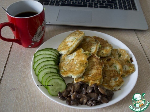 Отдельно обжарить на сковороде мелко нарезанные грибы (можно добавить немного зелёного лука), присолить их