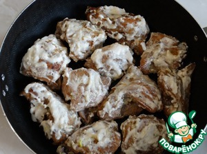 Влить сливки, посыпать кусочки мяса орехами и уцхо-сунели, тушить еще 5 минут.