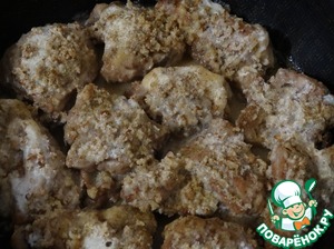 Курицу, в этот раз я обошлась куриными окорочками, нарезать на небольшие кусочки, посыпать солью и перцем. Обжарить на сковороде до румяной корочки и выложить на тарелку, чтоб немного остыло.