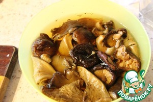 Сушеные грибы залить кипятком и оставить на 1 час. Затем промыть и нарезать соломкой.