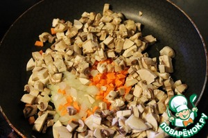 Готовим зажарку: шампиньоны, лук и морковь нарезать мелкими кубиками и обжарить с 2 ст. л. растительного масла, до золотистого цвета.