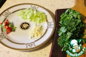 Зелень мелко нарубить, чеснок, перец болгарский и перец горький нарезать мелкими кубиками, добавить в кастрюлю за 2 минуты, до окончания готовки. Посолить и поперчить по вкусу.