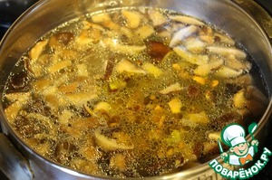 Картофель нарезать произвольными кусочками и отправить в бульон, когда картофель будет готов, потолочь его слегка толкушкой для пюре, прямо в кастрюле. Затем добавить к картофелю зажарку и сушеные грибы, варить 20-30 минут.