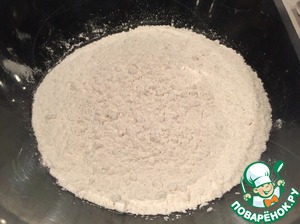 Просейте муку. Добавьте соль, чесночный порошок, дрожжи и размешайте.