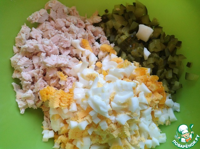 • С горошка слить лишнюю жидкость, лук и укроп мелко нашинковать. Огурец нарезать маленьким кубиком как и яйца. Грудку разобрать на волокна или порезать маленьким кубиком. Добавить молотого черного перца, майонеза и перемешать салат.